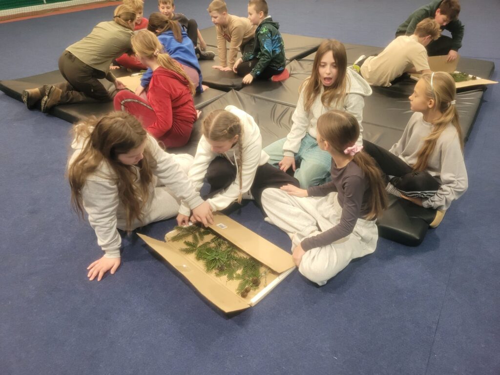 Drugą część spotkania stanowiło rozróżnianie drzew iglastych 🌲🌲. Dzieci uczyły się odróżniać m.in. sosnę, świerk i jodłę, zwracając uwagę na kształt igieł 🌿, szyszek 🌰 oraz wygląd całych drzew. Dzięki praktycznym przykładom nauka była nie tylko pouczająca 📚, ale także bardzo interesująca 😊.